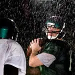 Two quarterbacks start with their right knees on the ground, facing each other ten yards apart. One quarterback has a ball on the ground next to his right leg. The quarterback picks up the ball with his power hand, puts the ball to his ear with his off- hand also on the ball and throws it to his partner quarterback across from him. The partner QB catches the ball, places it on the ground and does exactly the same thing throwing the ball back.